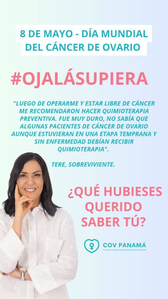 COV Panamá, la primera plataforma informativa para pacientes de cáncer de ovario, trompa de falopio y peritoneo de Panamá y la región conmemora este 8 de mayo el Día Mundial del Cáncer de Ovario con el lanzamiento de su nueva campaña #OAJALÁSUPIERA, iniciativa en donde sobrevivientes nos comparten qué información les hubiese gustado saber antes de su diagnóstico.