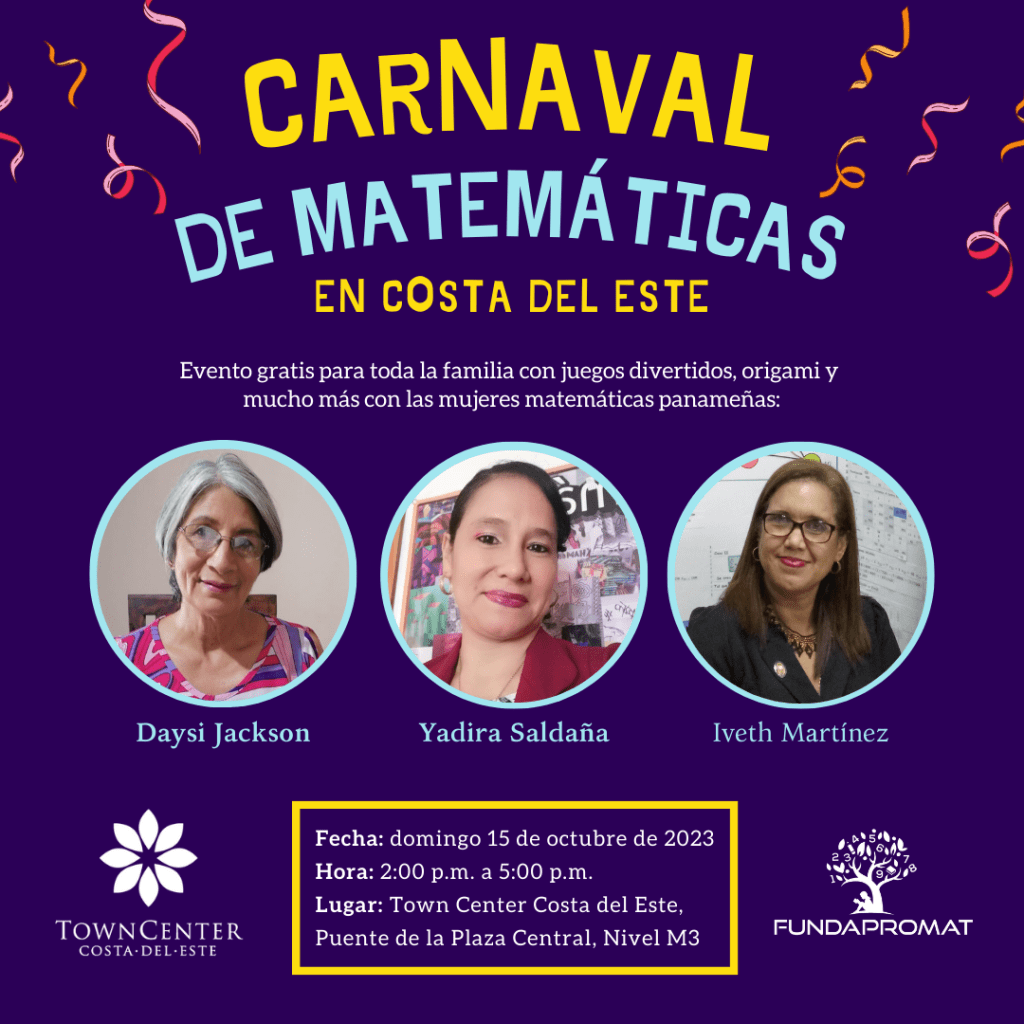 La Fundación Panameña para la Promoción de las Matemáticas (FUNDAPROMAT) organizará la edición 13 del Carnaval de Matemáticas, que se llevará a cabo el domingo 15 de octubre de 2:00 p.m. a 5:00 p.m. en Town Center Costa del Este, Puente de la Plaza Central, Nivel M3, en la capital del país.