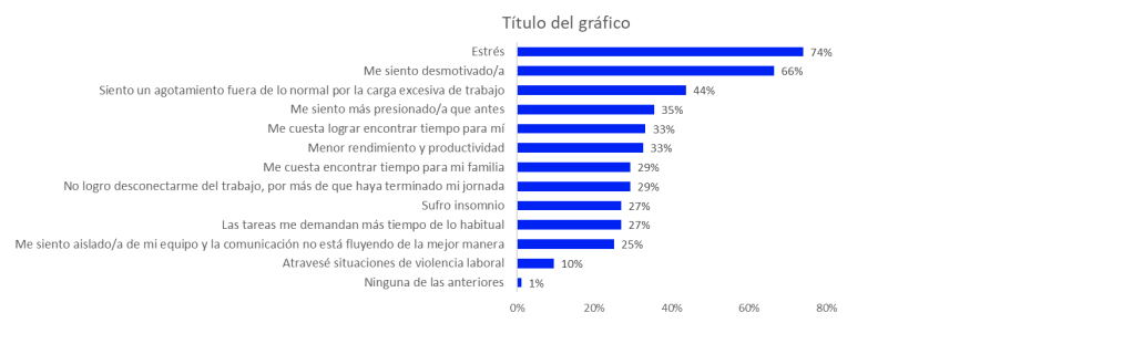 Los talentos atravesaron diferentes situaciones negativas en el ambiente laboral durante el último año. El 74% siente estrés; el 66% está desmotivado o desmotivada; el 44% experimenta un agotamiento fuera de lo normal por la carga excesiva de trabajo; un 35% está más presionado que antes; un 33% le cuesta encontrar tiempo para sí mismo, otro 33% nota que disminuyeron su rendimiento y productividad; el 29% no logra desconectarse de su empleo, y otro 29% le cuesta encontrar tiempo para su familia, un 27% sufre insomnio; otro 27% las tareas le demandan más tiempo de lo habitual; el 25% se siente aislado o aislada de su equipo y considera que la comunicación no está fluyendo de la mejor manera; un 10% atravesó situaciones de violencia laboral, y solo el 1% no ha experimentado ninguna de estas situaciones.