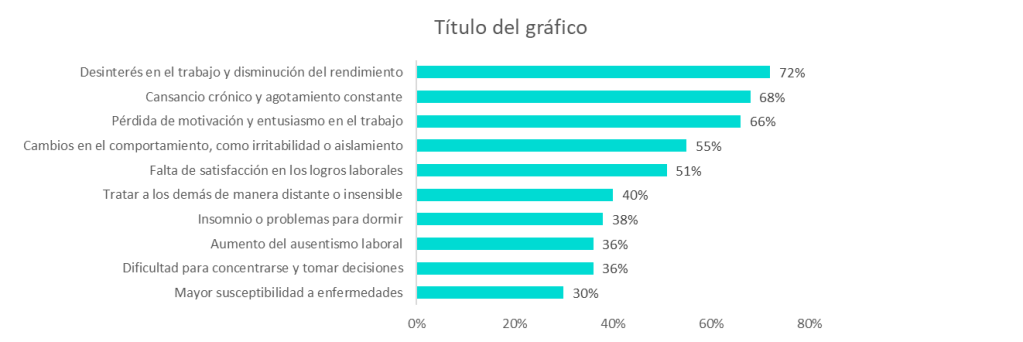 Entre los principales síntomas de burnout que identifican los especialistas en sus talentos, se encuentran: el desinterés en el trabajo y la disminución del rendimiento (72%); cansancio crónico y agotamiento constante (68%); la pérdida de la motivación y el entusiasmo en el trabajo (66%); cambios en el comportamiento, como irritabilidad o aislamiento (55%); falta de satisfacción respecto a los logros laborales (51%); un trato distante o insensible para con los demás (40%); insomnio o problemas para dormir (38%); aumento del ausentismo laboral (36%); dificultades para concentrarse y tomar decisiones (36%); y mayor susceptibilidad a enfermedades (30%).